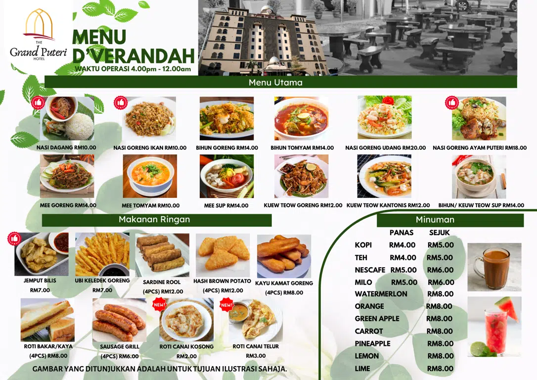 D’Verandah, located in front of The Grand Puteri Hotel Kuala Terengganu, operates from 4:00 PM to 12:00 midnight. It offers a variety of quality meals at affordable prices, making it an ideal spot to enjoy a relaxed dining experience. Perfect for dinner or hanging out with family and friends during the evening and late-night hours.